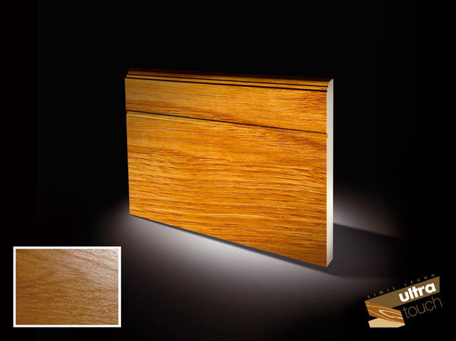 Paneel SECUR-PAN 615/42, ähnlich Golde Eiche TOUCH, mit einem oberem Mikrosicke. Fingerklemmschutzprofil (Nut und Feder). Aus doppeltem Stahlblech, vorlackiert, innere Seite Stucco und außere Seite glatt Holzdekor. Abschäumung mit Polyuhrethanschaumstoff, FCKW-frei. Mit zwei Innenversteifungen. Paneelgesamtstärke von 42 mm.