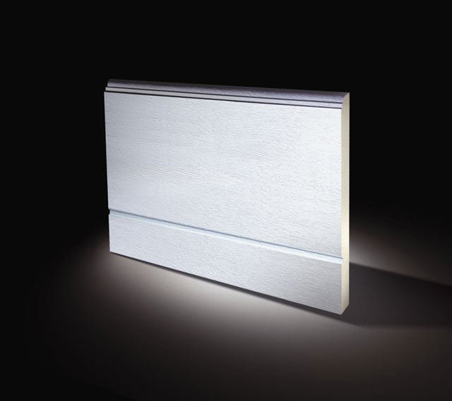 Paneel SECUR-PAN 615/42, C21, mit einem untemem Mikrosicke. Fingerklemmschutzprofil (Nut und Feder). Aus doppeltem Stahlblech, vorlackiert, innere Seite Stucco und außere Seite Woodgrain gaufriert (WG). Abschäumung mit Polyuhrethanschaumstoff, FCKW-frei. Mit Innenversteifungen. Paneelgesamtstärke von 42 mm.
