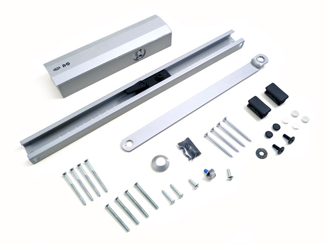 Aluminium sliding door closer for pedestrian door, 1200 mm. Suitable for doors with right or left opening. Adjustable closing speed and final push. Set includes door closer, slide and screws.