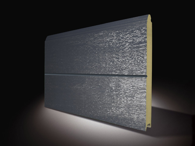 Panneau SECUR-PAN 495/42, 7016, avec une micro nervure central. Profilé mâle et femelle anti-pince doigts. Composé par deux tôles en acier galvanisé, prélaqué, côté intérieur finition stucco et extérieur woodgrain (WG). Remplissage avec mousse de polyuréthane sans CFC. Avec barres de renfort longitudinales à l’intérieur. Epaisseur du panneau 42 mm.